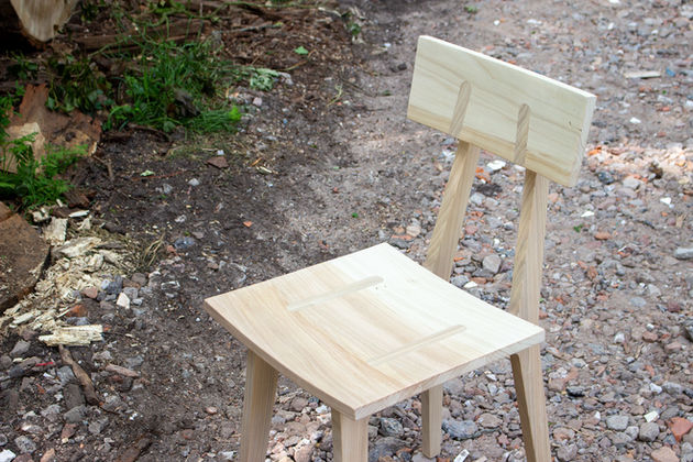 De eerste zeven stoelen zijn gemaakt van eikenhout, maar vanwege de onorthodoxe verbinding ben ik daarna overgestapt op populierenhout. Deze houtsoort is veel zachter, maar scheurt niet bij het krimpen en uitzetten van het hout. Daarnaast levert dit een vederlichte stoel op, met kleuren in zich, van bijna wit naar groen, grijs en soms een beetje paars.